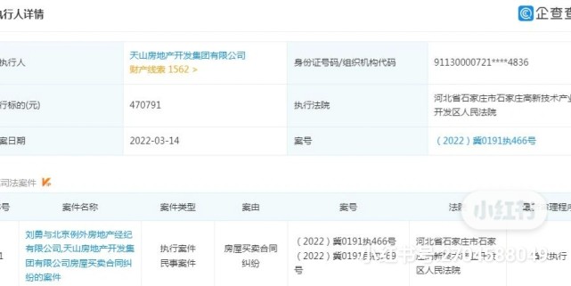 企查查显示,天山房地产开发集团有限公司涉司法案件578起,有被执行人记录37条,被执行总金额4497.02万元;有裁判文书记录452条,案件总金额为7888.35万元,企业作为被告的文书占比69.83%,涉案案由为房屋买卖合同纠纷的案件最多;有行政处罚记录1条。